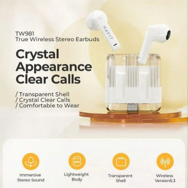 هندزفری بلوتوثی هویت مدل TW981 | بلوتوث 5.3، طراحی شفاف، درایور 13mm، کیس شارژ 300mAh