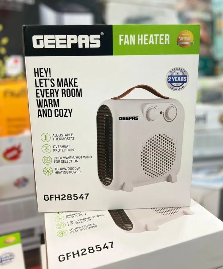 Geepas Fan Heater GFH28547 |3 Modes: Cool, Warm & Hot Wind |2 Power Options: 1000W/2000W |Adjustable Thermostat, Safety Fuse |Ideal for Homes & Offices