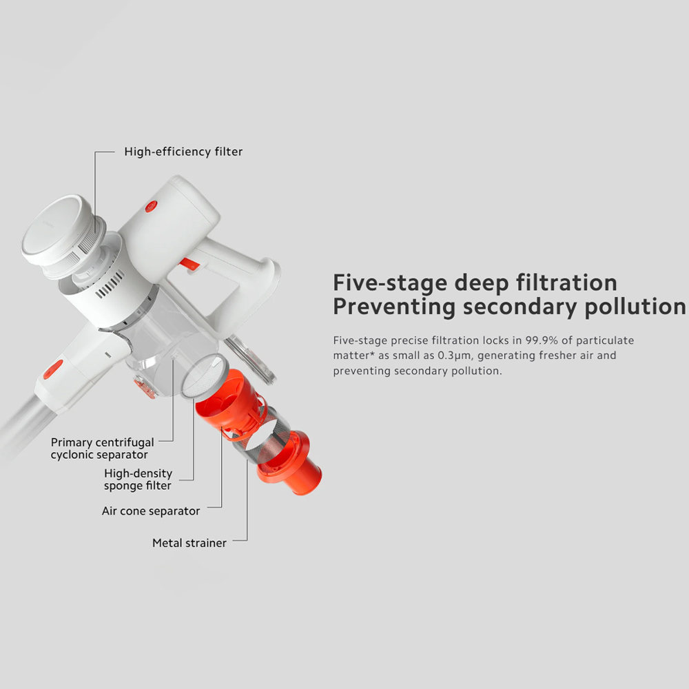 ساختار فیلتراسیون 5 مرحله ای در جارو شارژی سیائومی مدل G20 Lite به منظور جلوگیری از آلودگی ثانویه و تولید هوای تازه تر طراحی شده است. این سیستم فیلتراسیون دقیق قادر است ۹۹.۹٪ از ذرات معلق به اندازه ۰.۳ میکرو متر را حبس کند