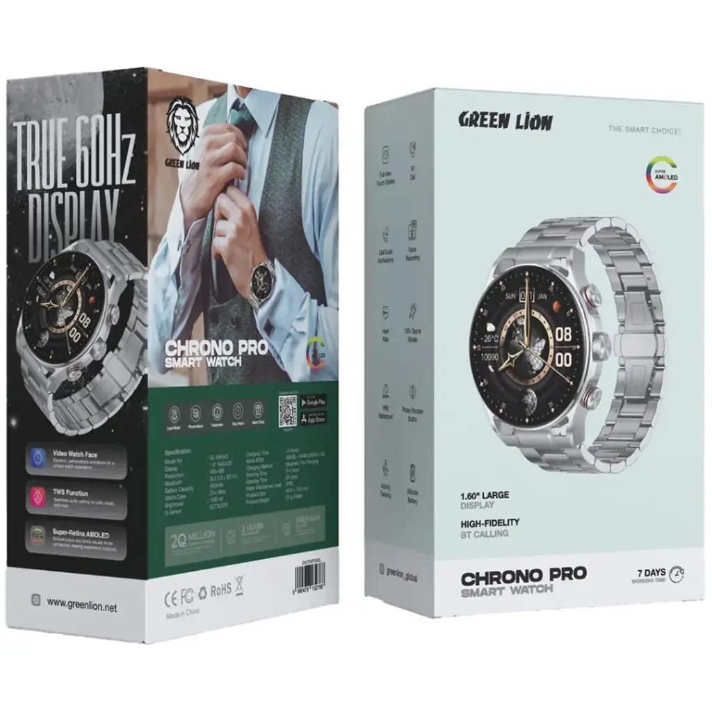 ساعت هوشمند گرین لاین Chrono Pro با نمایشگر 1.6 اینچی AMOLED، رزولوشن 480×480، روشنایی 1000 نیت، باتری 360 میلیآمپر با شارژدهی 5 تا 7 روز و استندبای 25 روزه، مجهز به تماس بلوتوثی، پایش ضربان قلب، مقاومت IP68 و طراحی لوکس؛ انتخابی عالی برای سبک زندگی مدرن.