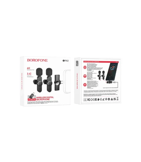 میکروفون یقهای بیسیم Borofone BFK12 با اتصال Lightning و Type-C، باتری 70mAh، 6 ساعت ضبط مداوم، صدای شفاف و حذف نویز محیطی. خرید از بالومبک گجت با گارانتی و ارسال سریع.