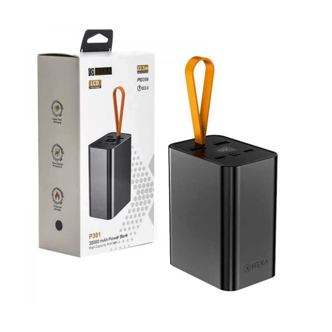 پاوربانک نکسا مدل P301 با ظرفیت اسمی 30000 میلی آمپر ساعت مجهز به 4 درگاه خروجی (2 عدد تایپ ای و 2 عدد تایپ سی)، شارژ سریع 22.5 وات و فناوری PD، بدنه مقاوم و باتری لیتیوم یون ایمن برای شارژ انواع موبایل ها و تبلت ها کاملا ایمن و قابل اعتماد است.