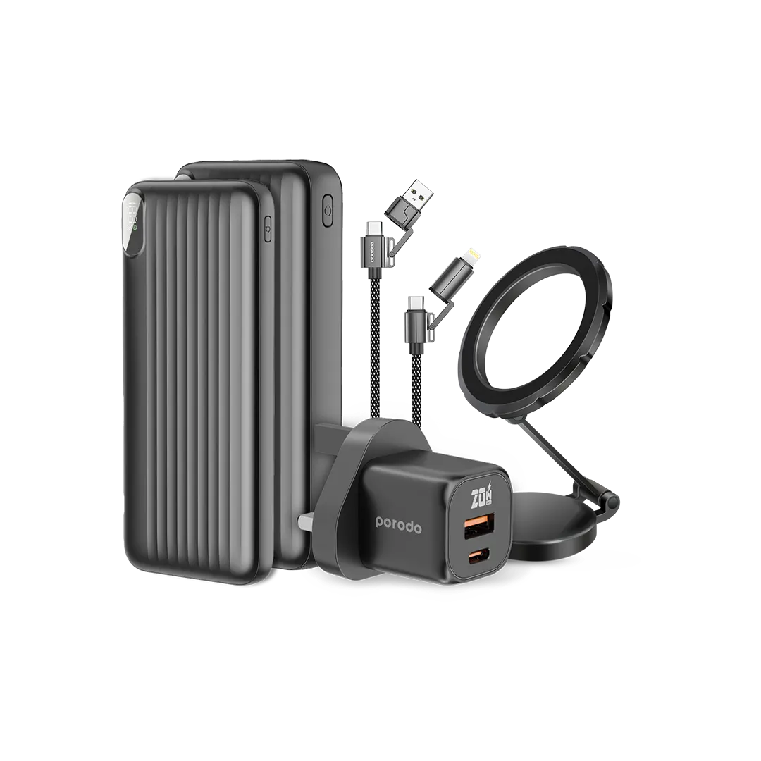 پک 6 در 1 پرودو شامل دو پاوربانک قدرتمند 10000 و 20000 میلی‌آمپر با شارژ سریع، شارژر GaN دو پورتی، کابل آلومینیومی 4 در 1، هولدر مگنتی خودرو و کیف حمل. راه‌حل کامل برای سفر، خانه و محل کار.