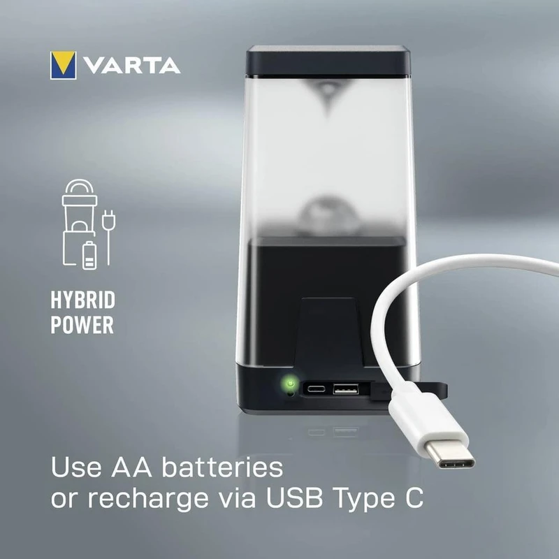 چراغ کمپینگ وارتا مدل L30RH با نور 360 درجه، قابل استفاده با باتری لیتیوم یونی و باتری قلمی، مقاوم در برابر آب و نور دهی چند حالته گزینه ای مناسب برای سفر و کمپ.