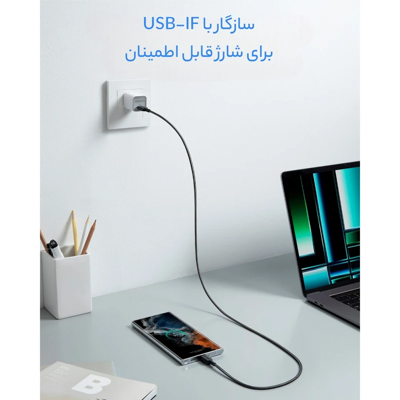 کابل انکر 322 USB-C به USB-C با شارژ سریع PD، طول 180 سانتیمتر، دوام 12,000 خم، سازگار با گوشیهای سامسونگ، آیفون 15، آیپد و لپتاپهای مجهز به USB-C. خرید از بالومیک گجت با گارانتی و ارسال سریع.